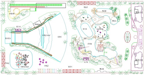? ? ? ?湖北黃石水上樂園占地28333平方,呈長方形狀,客戶投資額度不是很高,要求:以家庭合家歡為主,主要凸顯兒童快樂!因為項目是規矩的長方形,為了打破這種死硬格局,設計師用略顯活潑的兒童山坡滑梯以多個池階梯層次來分割長方形格局,